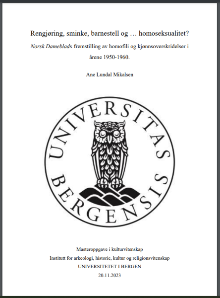 Ane Lundal Mikalsen har skrevet masteroppgave i Kulturvitenskap med tittelen Rengjøring, sminke, barnestell og... homoseksualitet? Norsk Dameblads fremstilling av homofili og kjønnsoverskridelser i årene 1950-1960 (Universitetet i Bergen, 2023).